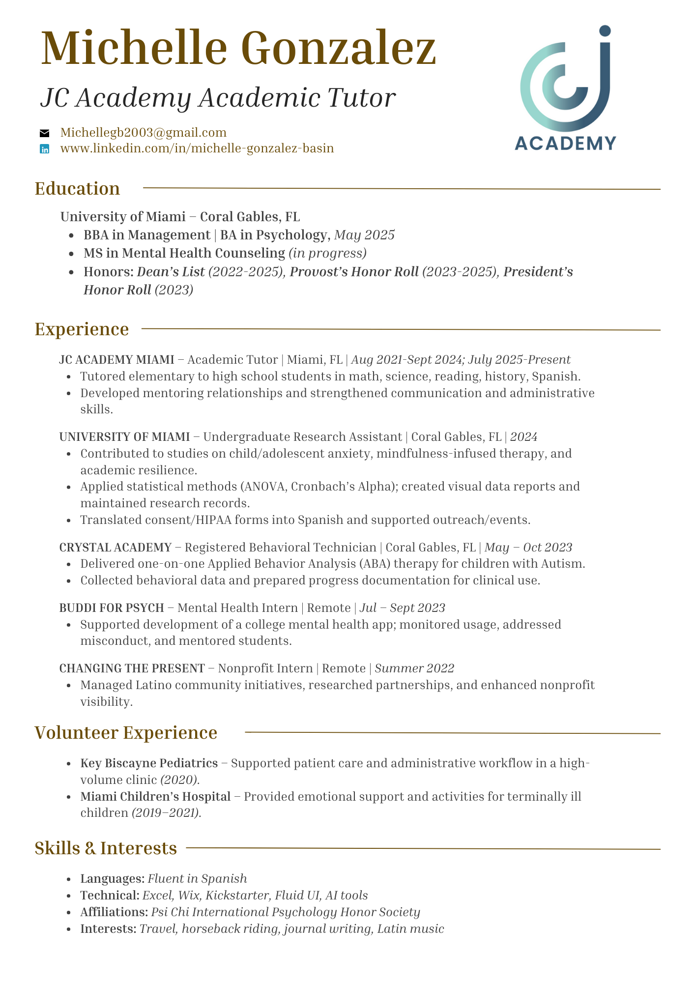 Michelle Gonzalez-Basin is a dedicated and experienced academic tutor with a strong background in both business and psychology. A University of Miami graduate and current master’s student in Mental Health Counseling, Michelle has been tutoring students from elementary to high school since 2021 in a wide range of subjects including math, reading, science, Spanish, and more. Known for her empathetic and organized approach, she fosters strong mentoring relationships that support both academic achievement and personal growth. Fluent in Spanish and skilled in educational tools, Michelle brings a compassionate, structured, and student-centered mindset to every tutoring session.