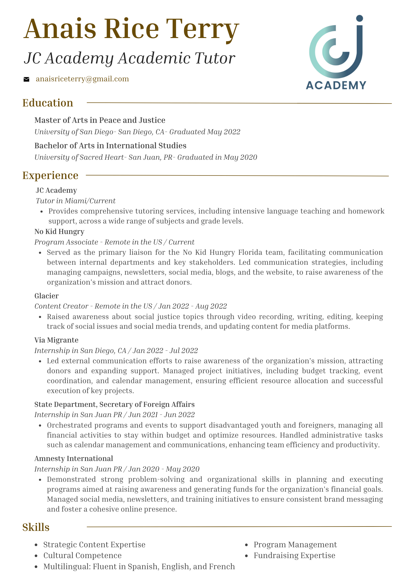 A dedicated professional with a Master of Arts in Peace and Justice from the University of San Diego. She brings a rich background in nonprofit management, social justice, and impact evaluation. Fluent in Spanish, English, and French, Anaïs is skilled in strategic content creation, fundraising, and program management. Her experience includes tutoring at JC Academy, serving as a Program Associate at No Kid Hungry, and various internships with organizations such as Via Migrante and Amnesty International. Anaïs is passionate about fostering cultural competence and supporting diverse communities.
