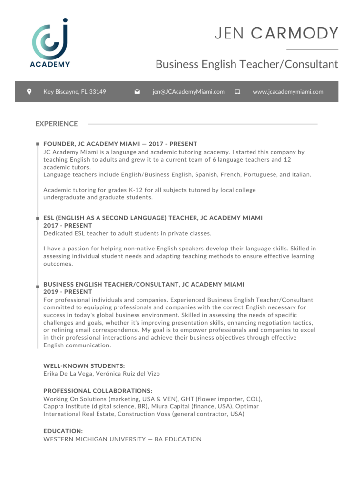 Founder, English Teacher, Business English Consultant, Brand Developer & Strategist, Writing & Editing Specialist