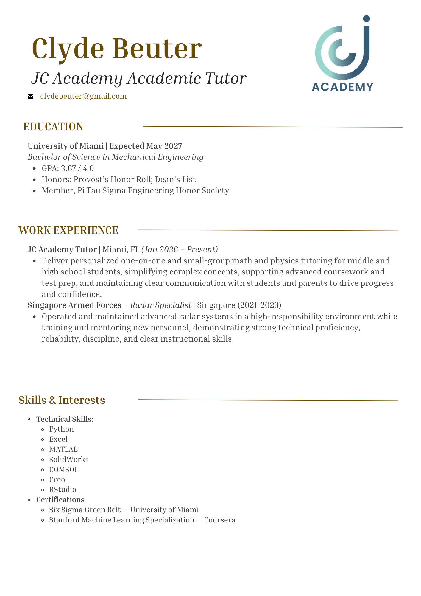 Clyde is from Portland, Oregon and is a junior majoring in Mechanical Engineering at the University of Miami. He has completed advanced mathematics coursework, including Calculus I–III and Differential Equations. Clyde enjoys working with students and helping them better understand challenging math concepts. In his free time, he enjoys playing and watching sports, spending time outdoors, and trying new restaurants. A fun fact about Clyde is he is also a citizen of Singapore and has fulfilled his two-year National Service requirement by serving as a radar specialist in the Singapore Armed Forces.