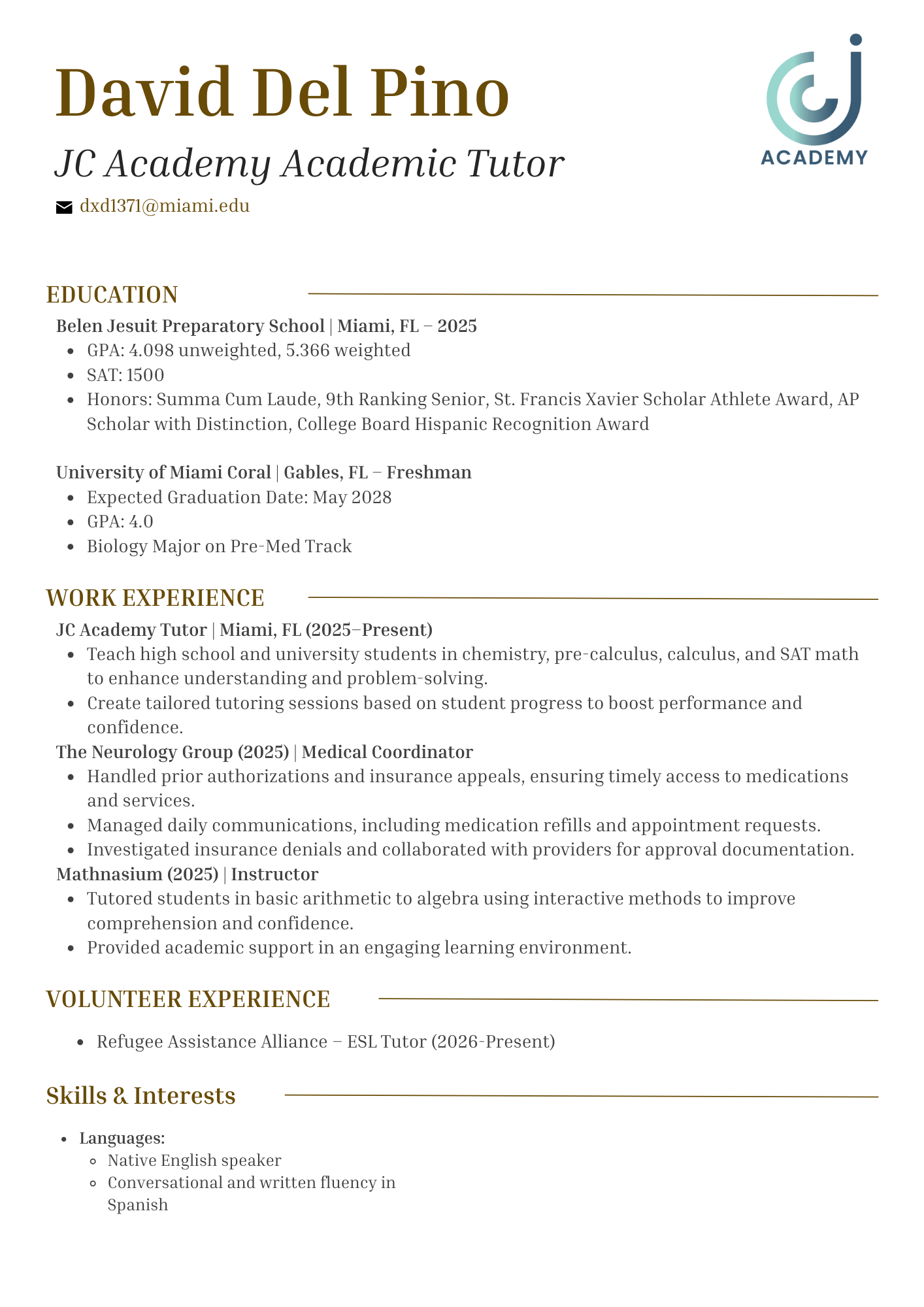 David Del Pino is from Miami, Florida, and graduated from Belen Jesuit High School. He is a Biology major on the pre-med track at the University of Miami. He is a member of the Phi Delta Epsilon medical fraternity and also plays on the UM club baseball team. In his free time, he enjoys going to the gym, playing baseball and basketball, and watching sports.