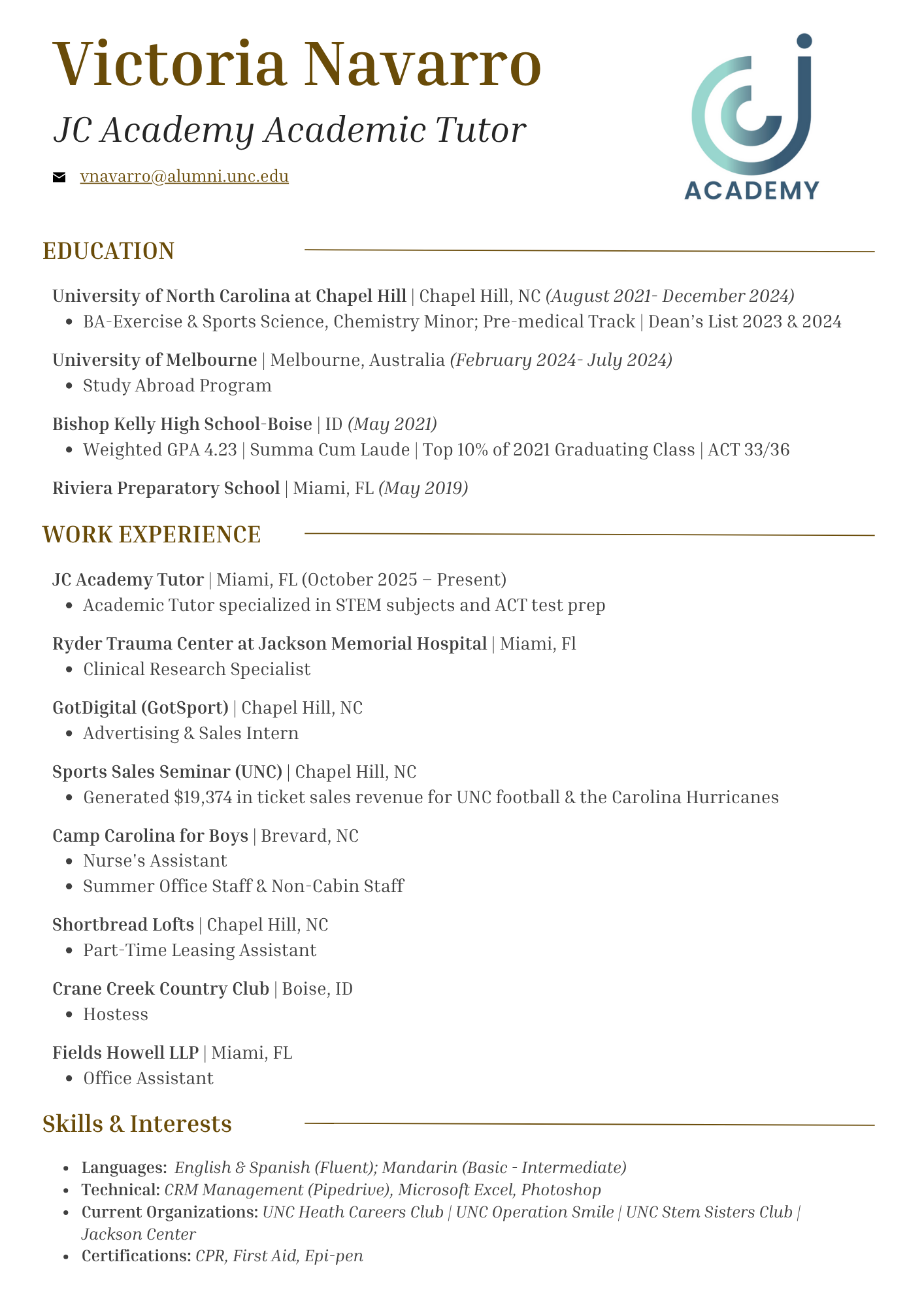 Victoria is a dedicated tutor with a strong background in all STEM subjects. She holds a degrees in Chemistry and Exercise & Sports Science from the University of North Carolina at Chapel Hill and is currently applying to medical school. Victoria’s approach centers on building a solid conceptual foundation while helping students discover study strategies and techniques to make tough topics click. She aims to build confidence, deepen understanding, and equip students with tools they can use across every subject.